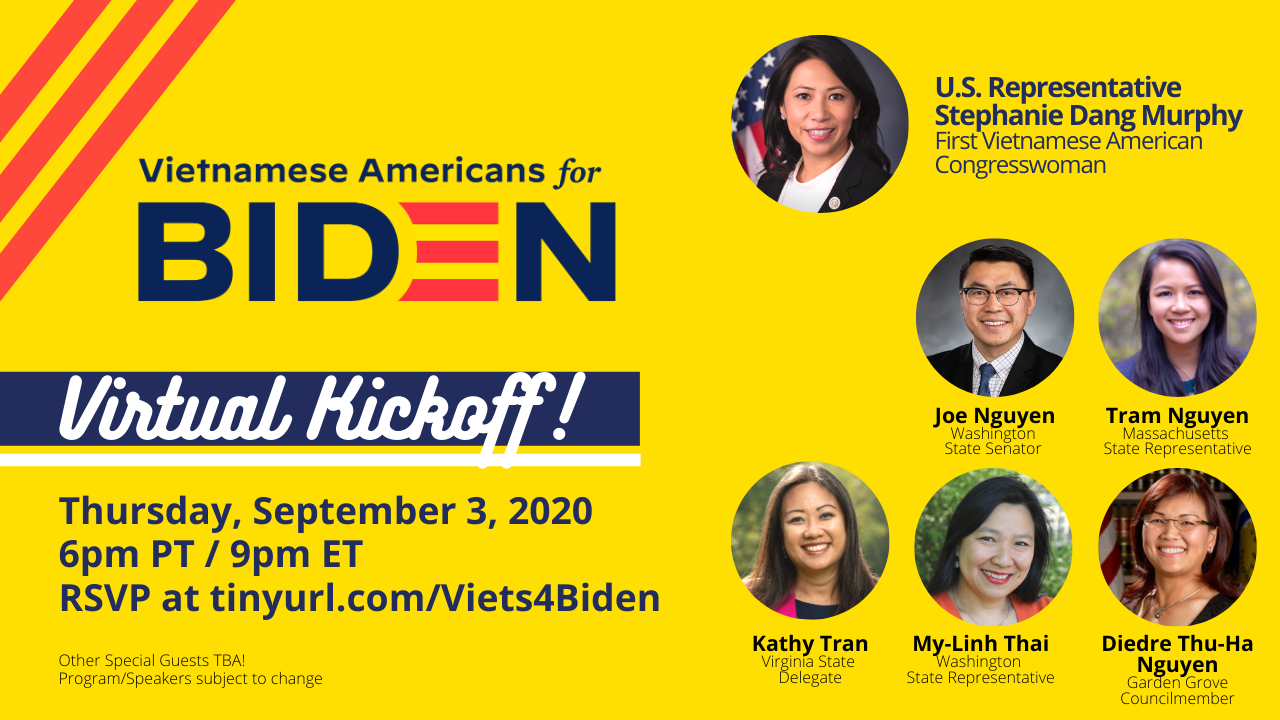 Ủy Ban Người Mỹ gốc Việt Ủng hộ Biden (VAfB) chính thức ra mắt. VAfB có kế hoạch hợp tác chặt chẽ với Ủy Ban Vận Đông Tranh Cử Biden Harris 2020 để bảo đảm chiến thắng vào tháng 11 năm 2020.