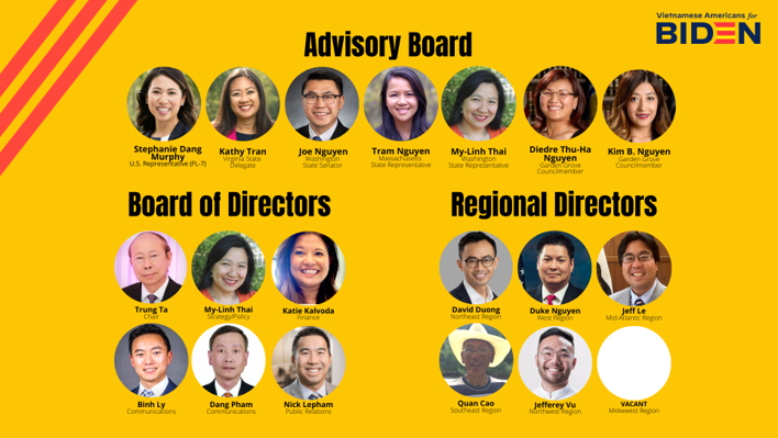 Tiếp theo, các thành viên trong Ban Cố vấn của Ủy Ban Người Mỹ gốc Việt Ủng hộ Biden gồm có Dân Biểu Tiểu bang Thái Mỹ Linh (WA), Nghị viên thành phố Kim Bernice Nguyễn (Garden Grove, CA), Dân Biểu Tiểu bang Trâm Nguyễn (MA), Dân Biểu Tiểu bang Kathy Trần (VA). và Thượng Nghị Sĩ Tiểu bang Joe Nguyễn (WA).đã thảo luận về những nét chính các chính sách quan trọng của ông Biden.