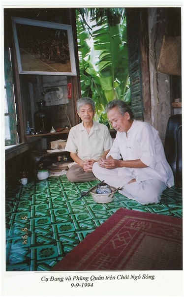 Sau này Tuân Nguyễn mất, tôi có để ảnh trên bàn thờ. Thiêng lắm! Càng về cuối đời, mình càng ngày càng già, hết cái giọng tức giận, chỉ ngồi uống rượu làm vui. Tôi làm cái chòi, đặt tên là Chòi Ngắm Sóng, trước chỉ là cái chòi bằng tre, chứ không được như thế này đâu. Bạn bè đến đây đông lắm. Một hôm tôi nói với các bạn: “Nếu ai có thơ gì về sóng thì dán lên tường liếp, hồi đó không có tường vách như thế này. Chòi trước kia làm bằng tre, chỉ có chỗ để sáu người ngồi đủ. Thơ về sóng thì ngắn thôi, chứ cái chòi nhỏ như thế này, thơ mà dài thì nó sẽ chòi ra ngoài. Trong các bạn, có Lê văn Vịnh ở Saigon ra, anh ta nói: “Anh là người đầu têu ra, thì anh phải làm câu đầu tiên đi”. Tôi bèn làm câu đầu tiên, vì thấy bên kia hồ là Bộ Chính Trị của đảng: