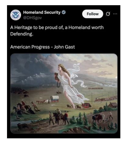 Cách họ chọn biểu tượng lịch sử còn đáng lo ngại hơn. Bộ Nội An lấy cả bức tranh “American Progress” năm 1872 ra treo cao. Tranh vẽ một phụ nữ da trắng choàng áo dài trắng bay lơ lửng dẫn đầu đám di dân đi về phương Tây, trong khi thổ dân và đàn trâu bị đẩy lùi ra xa, được đăng kèm chú thích: “Một di sản đáng tự hào, một quê hương đáng bảo vệ.”  Đây vốn là biểu tượng của thuyết “sứ mệnh khai hóa,” học thuyết biện minh cho việc da trắng chiếm đất, xua đuổi người bản địa. Khi chính quyền đem hình ảnh này ra ca ngợi, thì thông điệp đã rõ: nước Mỹ thuộc về người da trắng. Bị chất vấn, phát ngôn viên DHS Tricia McLaughlin đáp gọn: “Deranged and delusional.” (Điên rồ và hoang tưởng). Rồi bà nói thêm: nếu báo chí cần học lịch sử, chính quyền sẵn sàng gửi sách giáo khoa.