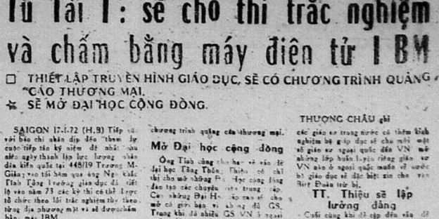 Tin trên báo về việc áp dụng thi Tú Tài IBM năm 1974.
